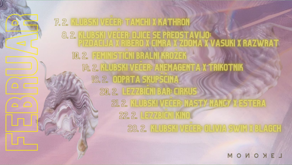 ŠKUC-LL obvešča: Monokel je lezbični klub. Lezbijke izrekamo dobrodošlico vsem kvirom, bi-, panseksualkam_cem, gejem, tetkam, taškam, nebinarnim in transspolnim, vsem LGBTIQ + ljudem, da skupaj oblikujemo varen prostor. V klubu ne toleriramo homofobije, seksizma, nacionalizma, rasizma, starizma in drugih oblik zatiranj. Obiskovalke_ce prosimo, da ekipo opozorijo na vsakršen pojav nasilja. To lahko storite osebno ali nam pišete na monokel@skuc.com in prek FB strani Kluba Monokel.